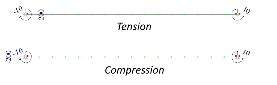 The design model is a plane frame; 16 bar elements, type 2; 17 elements type 51, concentrated rotational springs with stiffness CUY = -12,5 kN*m/rad (-6,25 kN*m/rad) for the bar under compression and CUY = 12,5 kN*m/rad (6,25 kN*m/rad) for the bar under tension; 17 nodes.