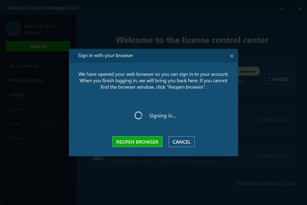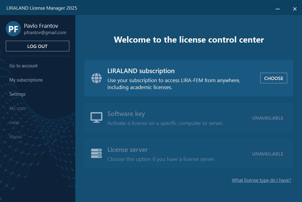 В главном окне LIRALAND License Manager в блоке «Подписка LIRALAND» нажмите кнопку «ВЫБРАТЬ».