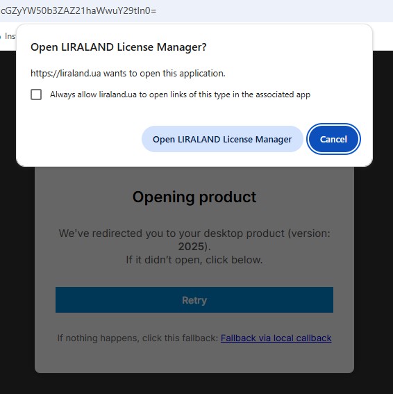Нажмите Open Liraland.License.Manager.exe. Также рекомендуется включить опцию Always allow liraland.ua to open links of this type.