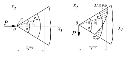 Визначення напруженого стану симетричного клину одиничної товщини при стиску і вигині зосередженими силами.