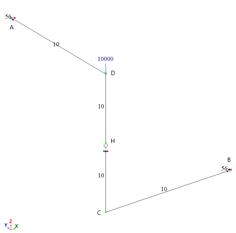 Визначити вертикальне переміщення Z для вузла з’єднання стержнів AD і HD (точка D), горизонтальне переміщення та кут повороту точки А, а також крутний і згинальні моменти Mx, My, Mz для вузлів закріплення просторової системи (точки А, В).