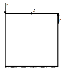 Розглядається квадратна пластина. Уздовж верхньої межі пластинки розміщено стержень, абсолютно жорсткий на згин та стиск-розтяг. У точці А (на верхній межі) вузол закріплений від горизонтального зсуву. По нижній межі пластинка жорстко затиснена. На пластинку діють дві зосереджені сили, спрямовані у протилежні сторони.