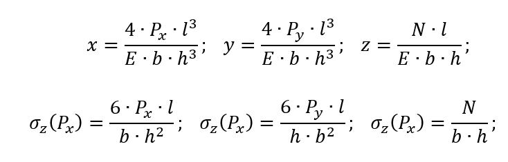 При аналітичному рішенні за недеформованими схемами переміщення вільного кінця x, y, z і максимальне напруження в защемленому перерізі σz визначаються за формулами: