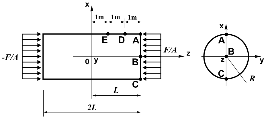 Визначити меридіональні Z(G) і радіальні X(G) переміщення точок E, D, A (C) бічної поверхні циліндра, віддалених від поперечної площини його симетрії вздовж твірної відповідно на відстані L/3, 2*L/3, L, а також точки B центру його торцевої поверхні.