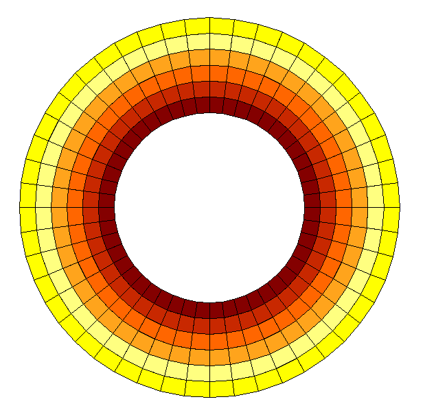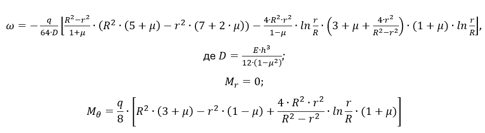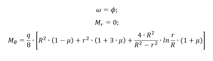 При аналітичному рішенні прогин w, радіальний Mr і тангенціальний Mθ згинальні моменти по внутрішньому контуру пластини можуть бути обчислені за такими формулами: