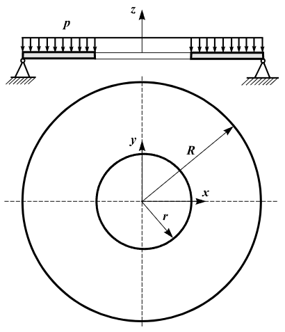 Визначення напружено-деформованого стану кільцевої шарнірно опертої пластини постійної товщини, навантаженої поперечним рівномірно розподіленим навантаженням.