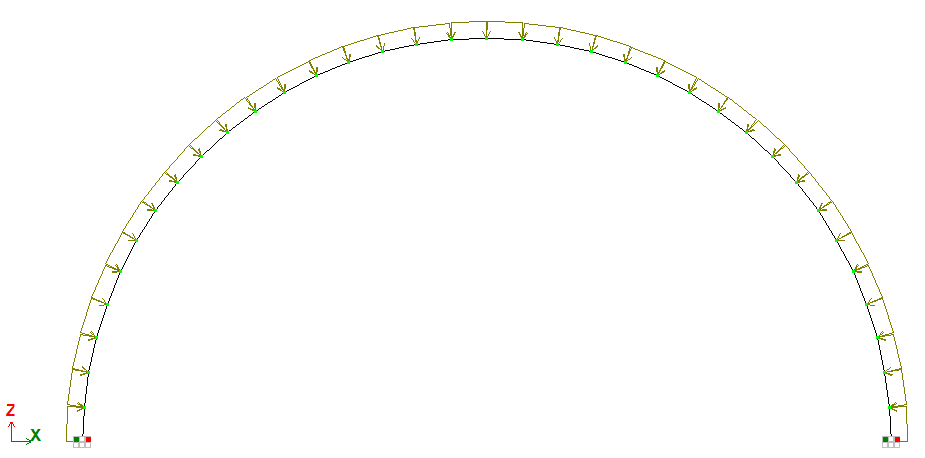 Розрахункова схема – плоска рама. Сітка скінченних елементів розбита по довжині поздовжньої осі арки (вздовж осей X1 місцевих систем координат) із кроком центрального кута 5,0° (1,667°). Вплив з початковим значенням рівномірно розподіленого радіального навантаження q задається у напрямку проти осей Z1 місцевих систем координат елементів.