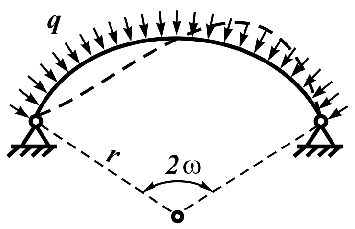 Кругова двошарнірна арка постійного перерізу піддається впливу від рівномірно розподіленого радіального навантаження q. Визначити критичне значення рівномірно розподіленого радіального навантаження qкр, що відповідає моменту втрати стійкості арки. Прийняти, що при втраті стійкості елементи навантаження слідують за віссю арки, зберігаючи паралельність своїм колишнім напрямкам, завдяки чому відбувається переміщення лінії тиску при втраті стійкості арки. Порівняти результат розрахунку з рішенням (С. П. Тимошенко), коли елементи навантаження при викривленні осі арки зберігають лінії своєї дії та лінія тиску при втраті стійкості арки не переміщається.