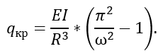При аналітичному рішенні для двошарнірної рами, складеної з рівних хорд, вписаних у дугу кола, критичне значення рівномірно розподіленого радіального навантаження qкр, відповідне моменту втрати її стійкості визначається за такою формулою: