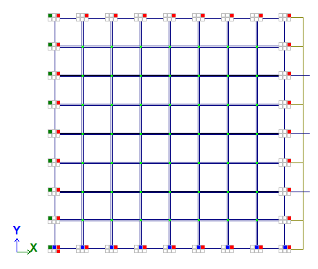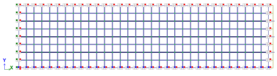 Розрахункова схема - система загального вигляду. Розглядаються дві розрахункові схеми із співвідношеннями сторін пластини a/b = 1,0; 4,0. Сітка скінченних елементів розбита по сторонах пластини (вздовж осей X та Y загальної системи координат) з кроком 0,075 м. На одному з двох протилежних поперечних торців пластини, схильних до впливу стискаючих зусиль, задаються рівномірно розподілена по лінії навантаження на пластину з початковим значенням p = σ*h = 1000 кН/м і вузлові навантаження на ребра з початковим значенням P = σ*F = 30 кН (вздовж осі X загальної системи координат).