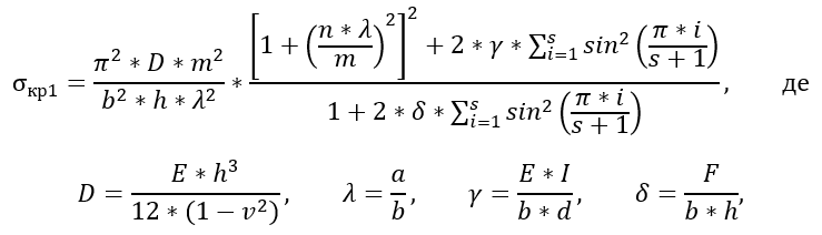 При аналітичному рішенні критичне значення стискаючих зусиль σкр1 у першому наближенні, що відповідає моменту втрати стійкості прямокутної підкріпленої пластини, визначається за такою формулою: